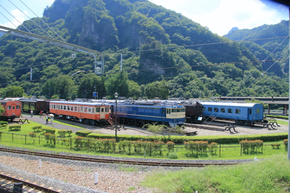 Just a 3-minute walk from Yokokawa Station is the Usuitouge Railway Heritage Park (碓氷峠鉄道文化むら Usuitо̄ge Tetsudо̄ Bunkamura), a popular railway theme park that exhibits history about the Former Usui Line (旧碓氷線 Kyū Usui-sen) and showcases vehicles formerly used on the abandoned railway between Yokokawa and Karuizawa, such as an Abt rack locomotive, EF63 trains, and other retro trains.