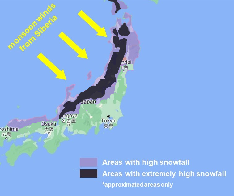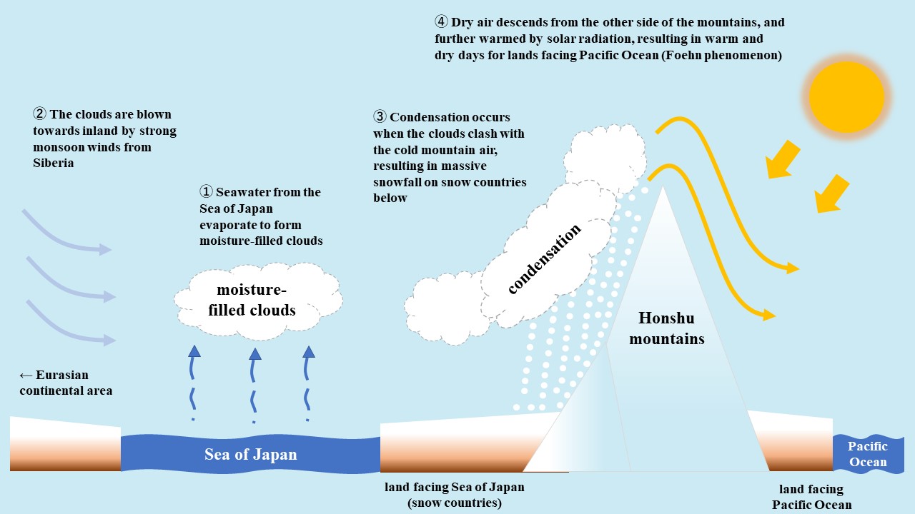 Snow countries are much snowier compared to other regions in Japan because of their geographical locations, mountainous terrains, and weather conditions. Seawater from the Sea of Japan evaporate to form moisture-filled clouds which are then blown towards the western front of Honshū by the monsoon winds from Siberia. Upon contact with the frigid mountain air, condensation occurs that result in massive snowfall on the land below. Because of this, snow countries such as areas in Niigata and Yamagata often experience cold and wet weather compared to areas facing the Pacific Ocean, which experience relatively warmer and drier days.