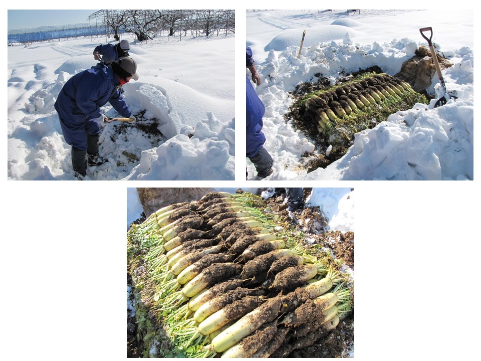 under-snow vegetables are sweeter specifically because of the storage methods. As the vegetables are stored in specific conditions—0°C, humidity levels of 90% or more, completely dark environment—protein turn into amino acids, the starch breaks down into sugars, and amino acids are naturally produced. This process, along with the method of burying them under snow, prevents freezing and helps rendering them more delicious. As the vegetables stay buried under snow, they undergo ageing where the odour disappears, and the texture and fibre become softer. Produce grown using this method in Yamagata include apples, cabbages, Chinese cabbages, radishes, and turnips.
