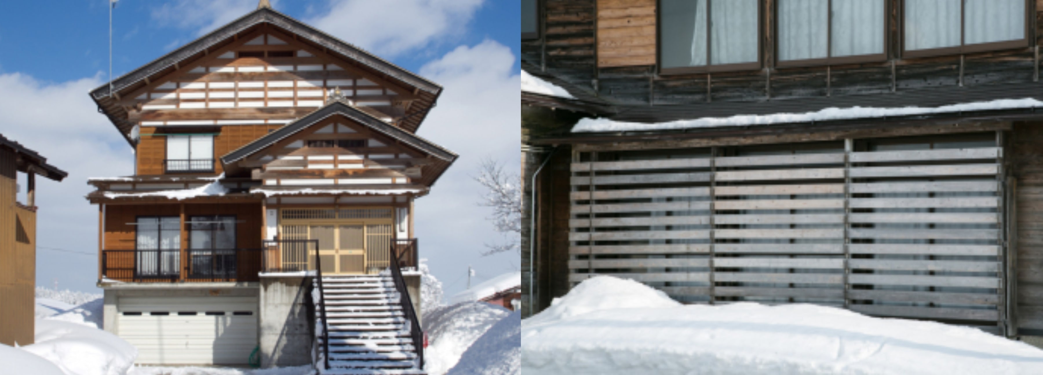 Because of the high snowfall, the first floor can get completely buried in snow and sunlight will be blocked out. Because of this, the garage and storeroom—both of which are not usually frequented by households—are located on the first floor, which is made from hard concrete to withstand piling snow. Snow enclosures (雪囲い yuki-kakoi) are installed outside the windows on the first floor to prevent snow from caving in and breaking the windowpanes, and they are designed in such a way that they can be uninstalled during non-winter seasons.