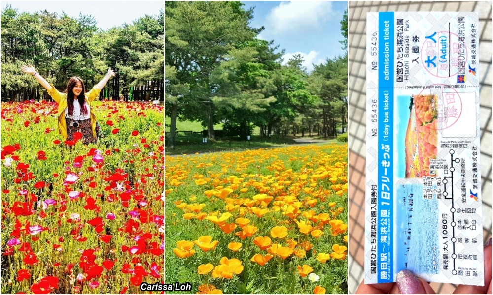 Red poppies (left), orange poppies (centre), bus + admission ticket (right). (Image credit: JR East / Carissa Loh)