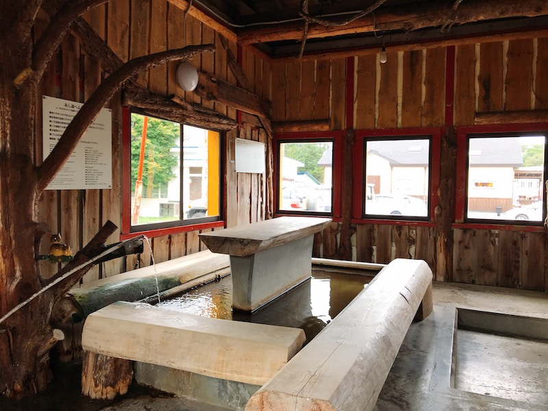In addition to the restaurant, Kawayu-Onsen Station also has a footbath (足湯 ashiyu). The footbath is used by not only people waiting for a bus or train, but also people visiting stores around the station. There are benches and a table made from logs, as well as heated floors.