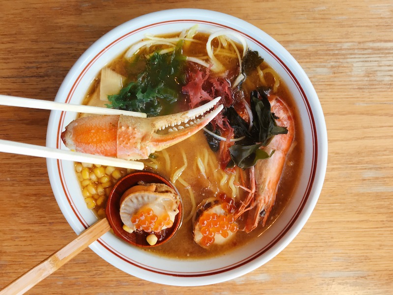 Other than the regular soy sauce, miso, and salt-based ramen, the Ekichо̄ ramen (駅長ラーメン) is highly recommended. In it, there is a lot of seafood like crab, scallop, salmon roe, and shrimp. Once you drink the soup, you can taste the flavour of the ocean spreading in your mouth.