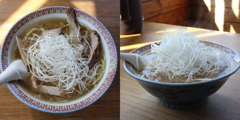 Also, the Tsū ramen topped with shiraganegi (白髪ネギ shredded white part of the green onion) and chāshū (チャーシュー thinly-sliced piece of braised pork) is popular among local people.