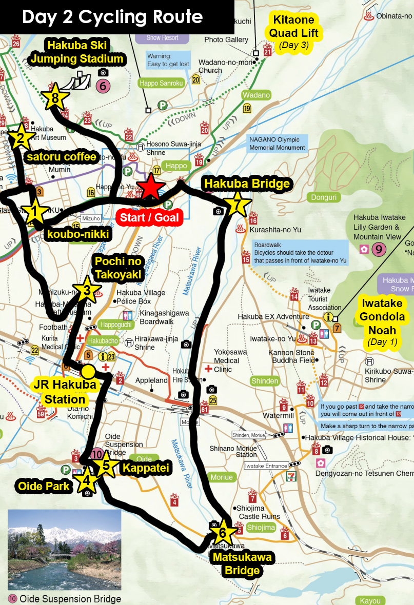 ภาพด้านบนคือแผนที่เส้นทางปั่นจักรยานในวันที่ 2 เราออกเดินทางและกลับมาสิ้นสุดที่ศูนย์ข้อมูลฮัปโป (八方インフォメーションセンター Happo Information Center) ซึ่งเป็นที่ที่เราเช่าจักรยานไฟฟ้ามา