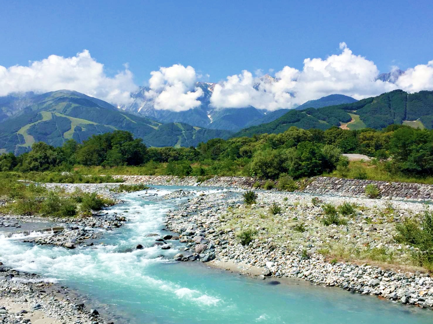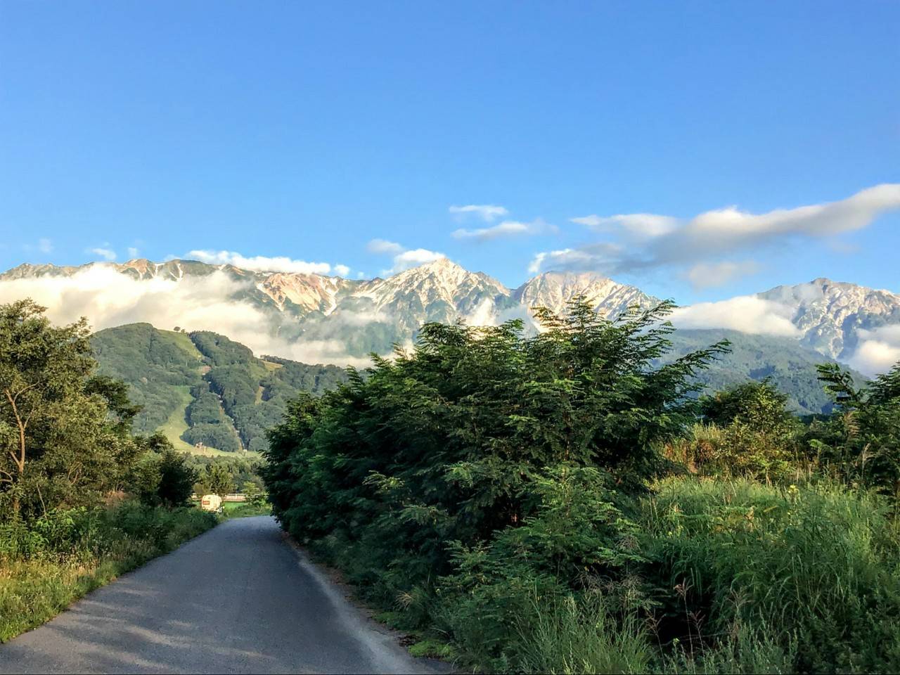 ในขณะที่เราขี่จักรยานไปเรื่อยๆ ยอดเขาฮาคุบะซันซังก็ปรากฏสู่สายตา ช่างน่าทึ่งที่ยอดเขาทั้งสามได้แก่ ชิโรอุมะดาเคะ (2,932 เมตร), ชะกุชิดาเคะ (2,812 เมตร) และฮาคุบะ ยาริงาทาเคะ (2,903 เมตร) ที่เรียกรวมกันว่า ฮาคุบะซันซัง 白馬三山 สามภูเขาแห่งฮาคุบะ) ดูเหมือนอยู่ใกล้เรามากๆ และแม้จะเป็นหน้าร้อนแต่บนยอดเขาก็ยังคงมีหิมะอยู่นิดหน่อย