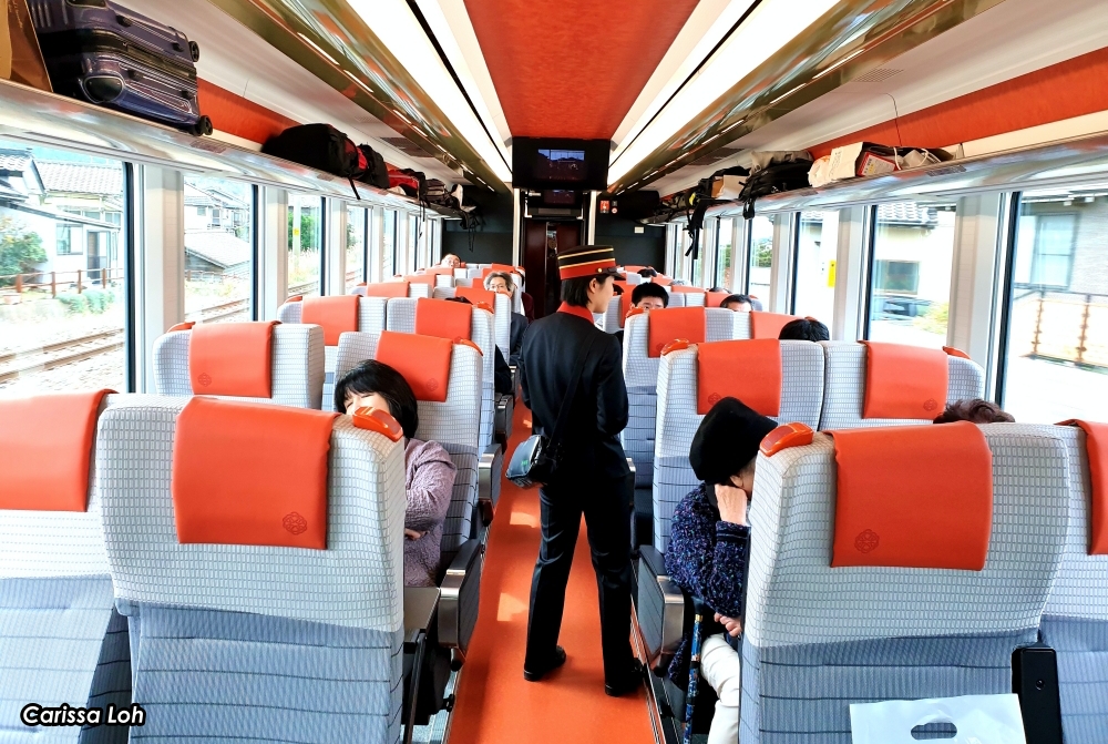 ตู้รถคันที่ 1 รองรับผู้โดยสารได้ทั้งหมด 30 คน และประกอบด้วยที่นั่งแบบคู่ปกติ ที่นั่งทั้งหมดมีพื้นที่วางขากว้างสบาย มีเบาะรองหัวสีส้ม และทุกที่นั่งสามารถปรับเอนนอนได้ หน้าต่างข้างที่นั่งเป็นหน้าต่างใหญ่บานกว้างให้ผู้โดยสารสามารถชมทะเลสีไพลินและนาข้าวสีทองในฤดูใบไม้ร่วงขณะนั่งรถผ่านได้