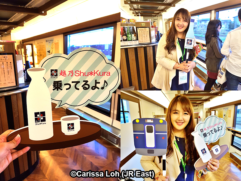 บนขบวนรถนั้นมีพร๊อพมากมายให้เราถือถ่ายรูปกันได้ เช่นป้ายที่เขียนว่า “越乃Shu*Kura乗ってるよ” ที่แปลได้ว่า “เรานั่งรถไฟ Koshino Shu*Kura อยู่นะ” นอกจากนี้คุณอาจจะได้พบเพื่อนใหม่ในกลุ่มผู้โดยสาร Koshino Shu*Kura ที่เป็นกันเองมากๆ และมักจะเข้ามาทักทายพูดคุย และช่วยถ่ายรูปให้อีกด้วย