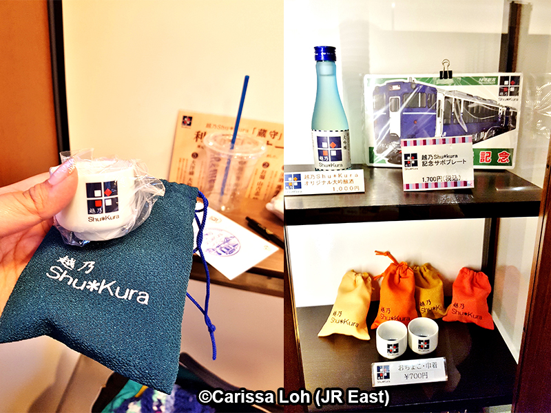 ถ้าคุณอยากจะได้อะไรติดมือกลับไปเป็นที่ระลึก บนรถจะมีจอกสาเก Koshino Shu*Kura (700 – 1,800 เยน) สาเกสูตรต้นตำรับของ Koshino Shu*Kura (1,000 เยน) พวงกุญแจ (950 เยน) หรือแม้แต่ป้ายที่ระลึก (1,700 เยน) ให้เลือกซื้อกันได้