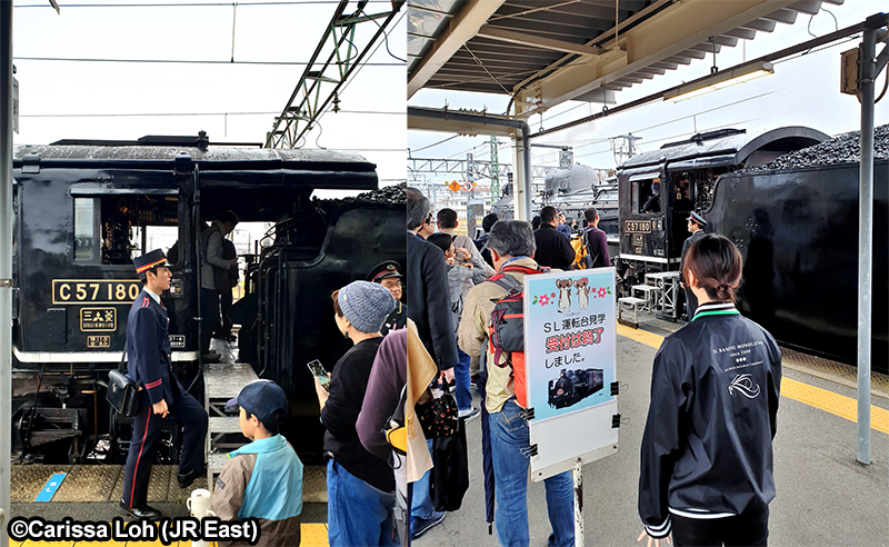 ผู้โดยสารต่อแถวเพื่อรอเข้าไปชมห้องเครื่องของรถไฟ (เครดิตรูปภาพ: JR East / Carissa Loh)