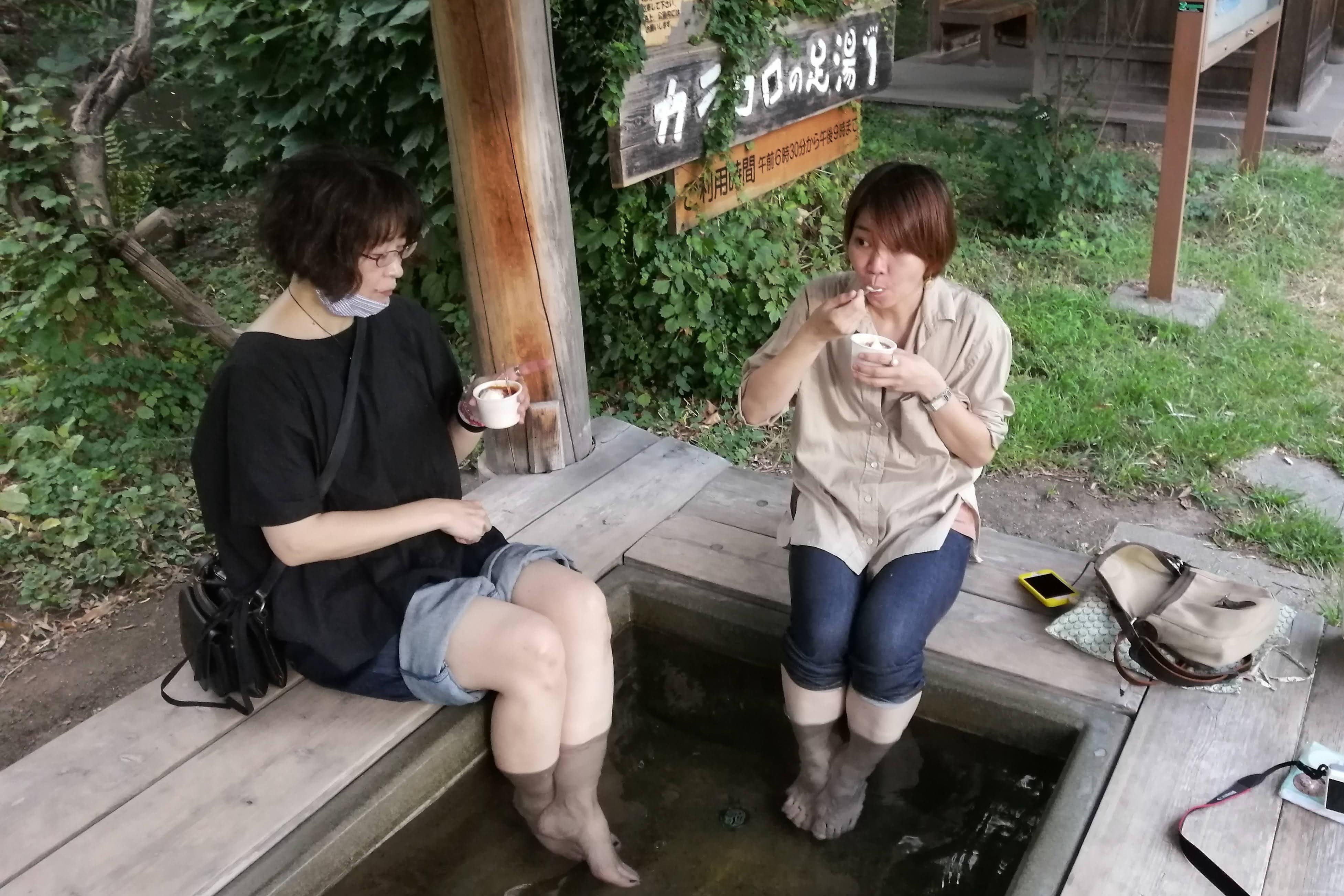 Enjoying apricot jam soft-serve ice cream on a footbath. (Image credit: 信州千曲観光局)