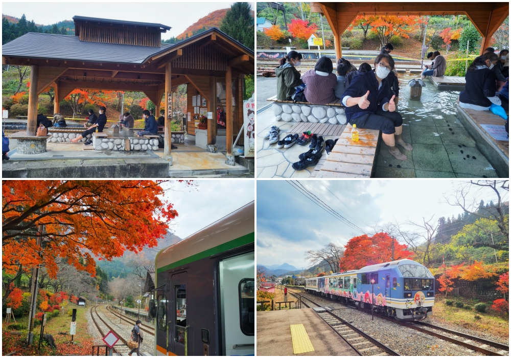 Apart from its vintage architecture and old-style thatched roof (same as the ones at Ouchijuku), this station also has foot bath (足湯 ashiyu) available for free. Soak your foot in the warm water and bask in the beautiful autumn scenery. You will also get a chance to see trains with cute decorations passing by. Nothing beats a short break like this.