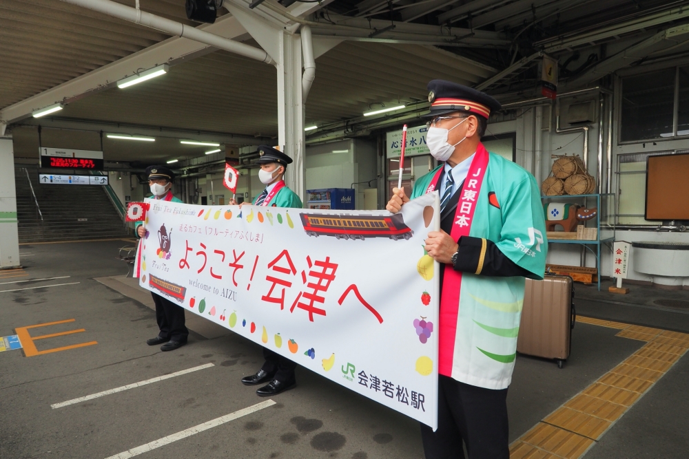 Staff holding a banner to welcome FruiTea Fukushima riders to Aizu-Wakamatsu Station. (Image credit: KrobkruengJapan)