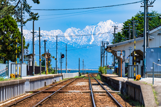 View of Toyama Bay and the snow-capped Tateyama Mountain Range from JR Amaharashi Station. (Image credit: まちゃー/PIXTA)