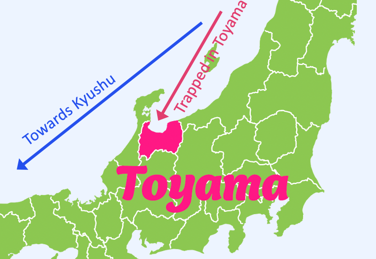 JR Toyama Station (富山駅) is approximately a 2-hour ride on the Hokuriku Shinkansen from JR Tо̄kyо̄ Station (東京駅), making it a very quick and convenient getaway.