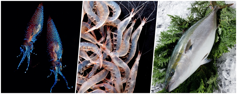 Toyama’s three prefectural fish: hotaru ika, shiroebi, and kanburi. (Image credit: とやま観光推進機構)