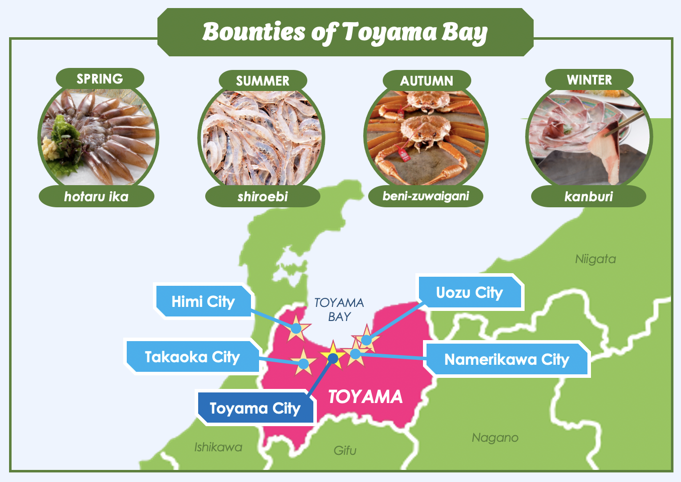 Let’s check out four of Toyama’s representative seafood delicacies, which have their own “titles” and specific season of the year to be best enjoyed: