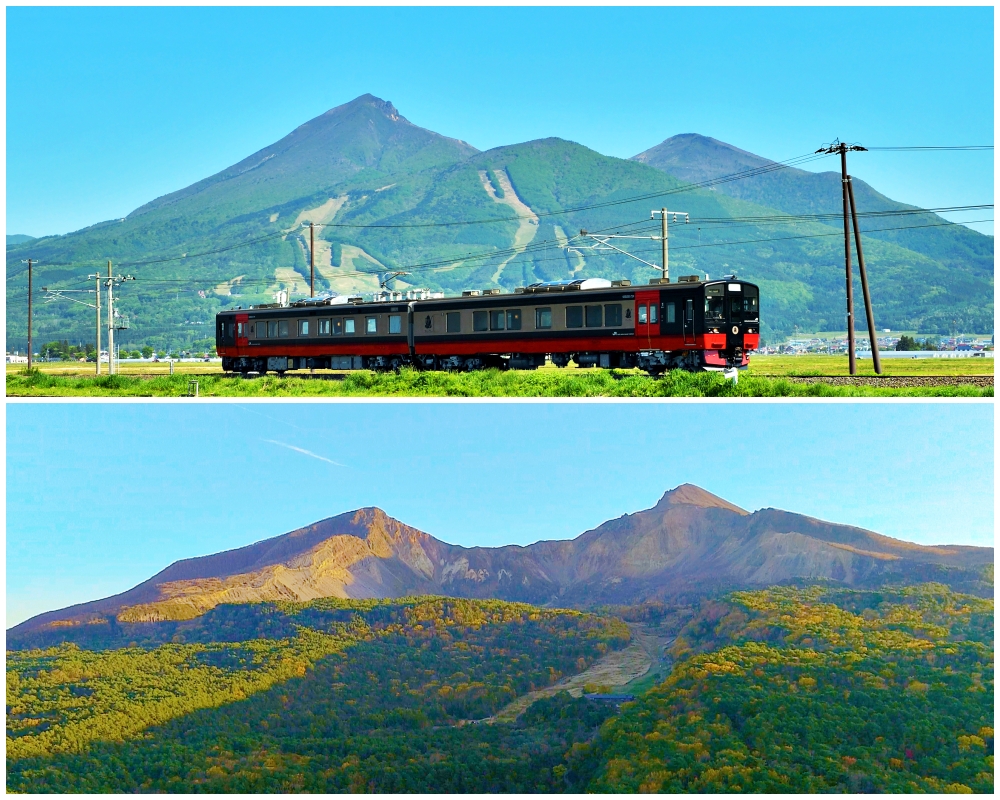 View of Mount Bandai from the southern side (top) and from the northern side (bottom). (Image credit: JR East and 裏磐梯観光協会)