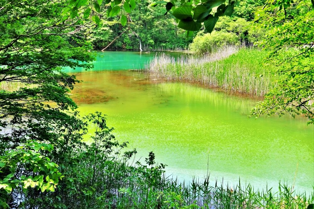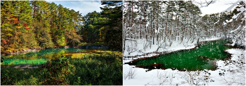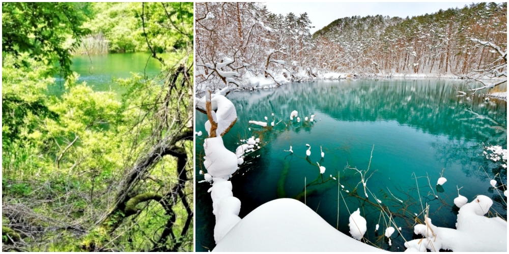 Next up is Rurinuma (瑠璃沼), a pond with a stunning blue colour. “Ruri” means “lapis lazuli”, a mineral with an eye-catching blue colour, and like its name Rurinuma also has a captivating blue colour. With a depth of 9m, a special feature of Rurinuma is that warm groundwater constantly feeds into the pond, so it does not freeze over in winter.