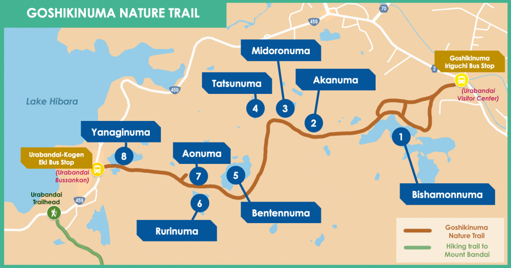 Access: From JR Inawashiro Station (猪苗代駅), take a 30-minute bus ride and get off at Goshikinuma Iriguchi (五色沼入口) Bus Stop, then walk 3 minutes to the start of the trail at Urabandai Visitor Center.