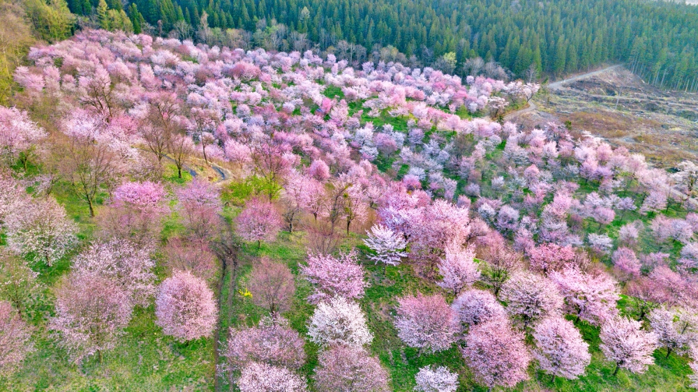 From late April to early May, 3,000 cherry blossom trees at Sakuratoge Ridge (桜峠) bloom a lovely shade of pink. The cherry blossom trees here are mostly of the Oyamazakura (オオヤマザクラ) variety, which have flowers that are a darker and more vivid pink compared to the common pale pink someiyoshino variety.