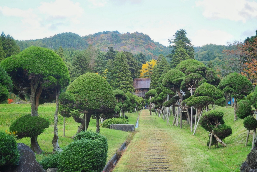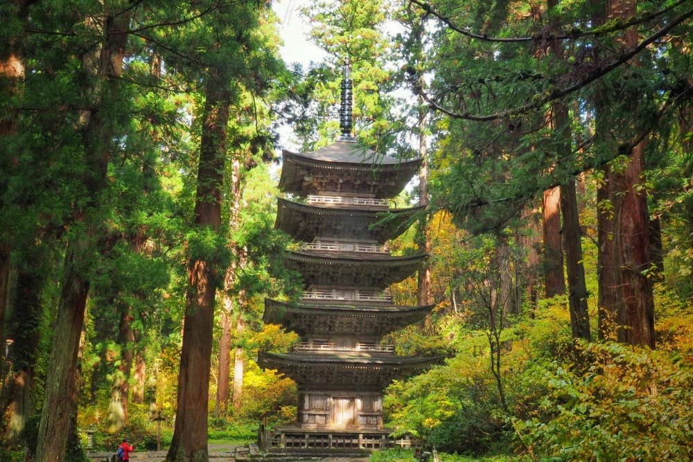 Dọc hai bên bậc thang dẫn lên chùa là những cây tuyết tùng 300–500 năm tuổi. Ở đây có đến hơn 400 cây tuyết tùng cổ thụ, nên đã được đánh giá tận ba sao theo tiêu chuẩn của hiệp hội du lịch Michelin Green Guide Nhật Bản, và được công nhận là Bảo vật Quốc gia của Nhật. Náu mình lặng yên giữa rừng tuyết tùng ấy là một ngôi chùa năm tầng, được xây dựng vào năm 937 sau Công Nguyên, nó là ngôi chùa cổ xưa nhất vùng Tohoku, và cũng được công nhận là Bảo vật Quốc gia của Nhật Bản vào năm 1966.