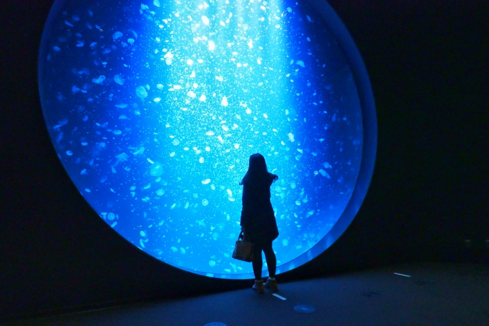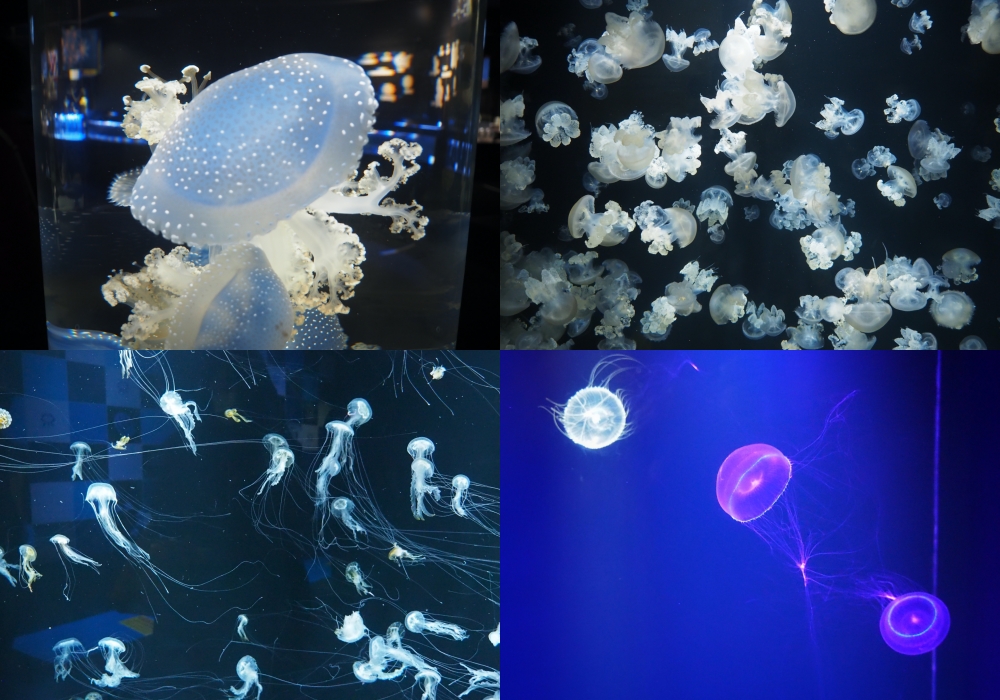 Bể sứa ở đây vô cùng đồ sộ với đường kính lên đến 5m, ở đó du khách có thể nhìn thấy đủ loại sứa lững lờ thả dáng. Những con sứa trong bể này là Sứa Mặt Trăng (ミズクラゲMizu-kurage) hay còn có tên khoa học là Aurelia Aurita. Mình không đếm nổi có bao nhiêu con sứa bên trong, bởi luôn có vô số con trôi dạt quanh bể, như những mặt trăng nhỏ lơ lửng vậy.