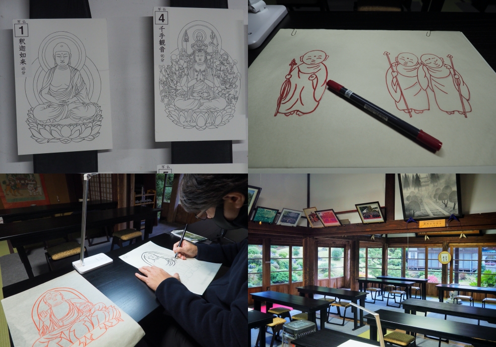 Nếu quan tâm đến nghệ thuật vẽ tranh Nhật Bản shabutsu (写仏) hoặc nghệ thuật thư pháp Nhật Bản shakyo (写経), hãy thử trải nghiệm chúng tại đây. Với shabutsu, bạn sẽ được cung cấp một bức tranh làm mẫu để tự vẽ, và hoạt động này giúp thư giãn rất tốt. Mỗi bức tranh cần một lượng thời gian khác nhau để hoàn thành, tùy theo độ khó của nó: từ 10 phút đến 90 phút. Đầu tiên, hãy chọn mẫu tranh của bạn và một chiếc bút bạn sẽ dùng, sau đó bắt đầu. Khóa trải nghiệm này có giá 1.500 yên (khoảng 311.000 vnđ), bạn sẽ được vẽ một bức tranh và nhận được một suất trà xanh cùng đồ ngọt.