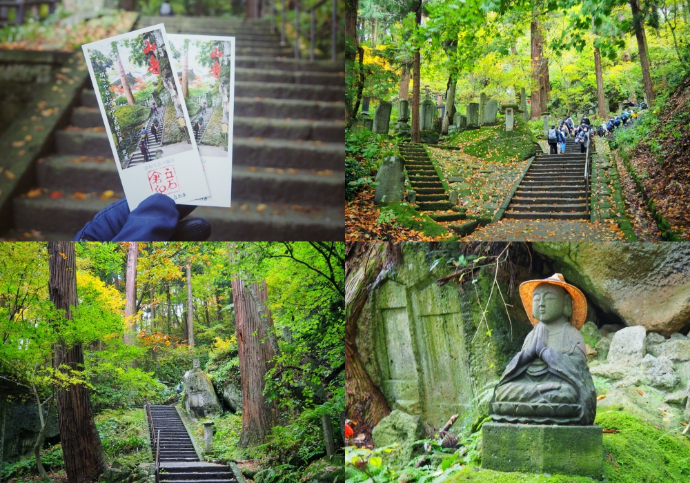 Đối với chúng mình thì lên đến Okunoin (奥の院) - khu vực sâu trong cùng của Yamadera mất khoảng 1 giờ. Leo lên những bậc thang không khó như chúng mình nghĩ, nhưng quả thực rất tốn sức. Có những rặng thông trải dọc con đường 1000 bậc, cùng với vô số tượng phật, một vài bức phủ rêu phong xanh mướt. Trên đường bạn còn có thể ngắm lá đỏ, cùng mái chùa truyền thống ở hậu cảnh xa xa.