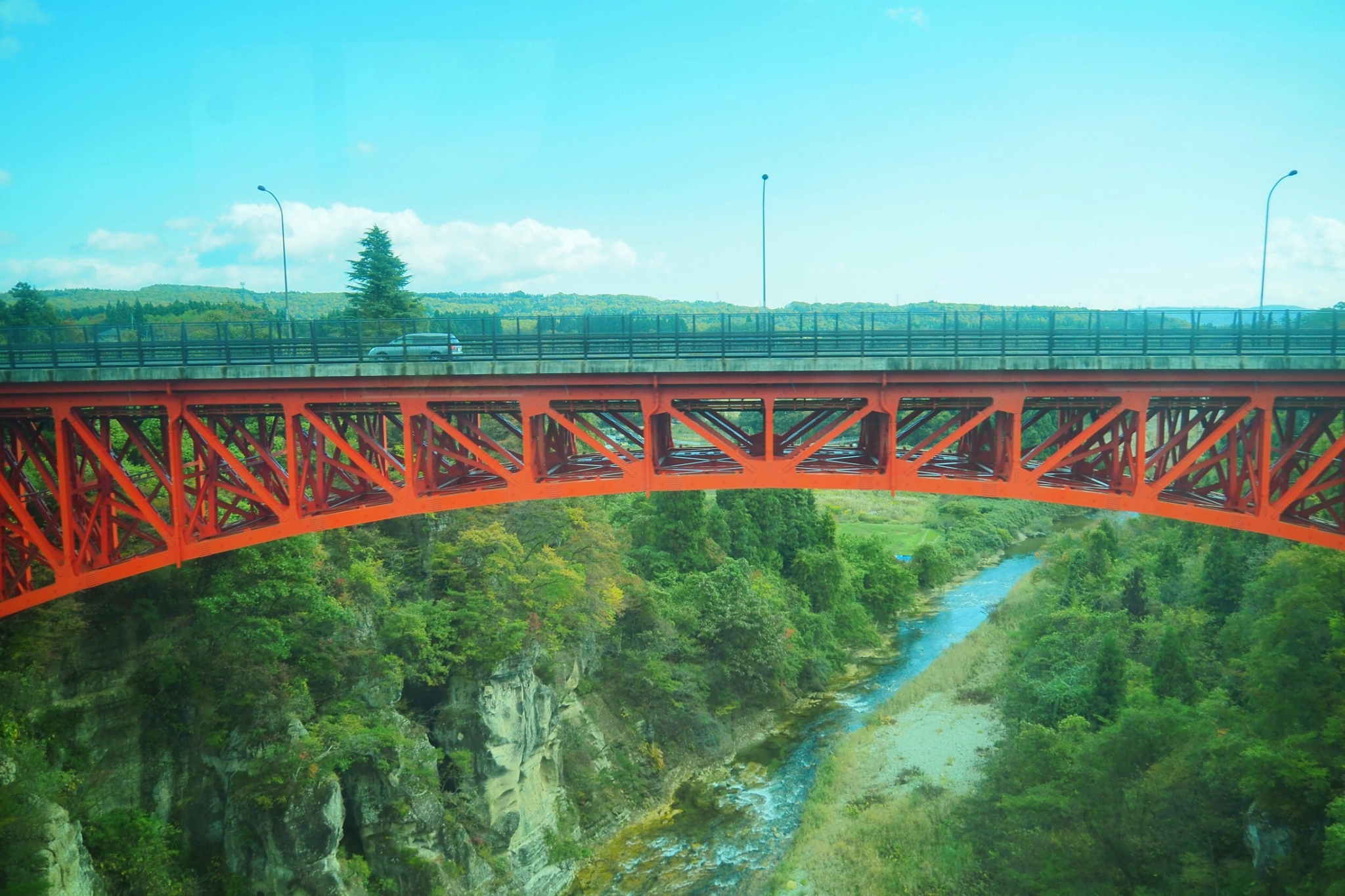 Khởi hành từ Tokyo, chúng mình bắt tàu cao tốc đến ga Sendai và chuyển sang tàu địa phương trên tuyến JR Senzan, hướng đến ga Yamadera. Trên đường đi, bạn có thể thấy một cây cầu đỏ rực. Mình đã suýt bỏ lỡ cơ hội chụp ảnh nó, nhưng may mắn thay, cuối cùng cũng kịp có một bức ảnh kỷ niệm.