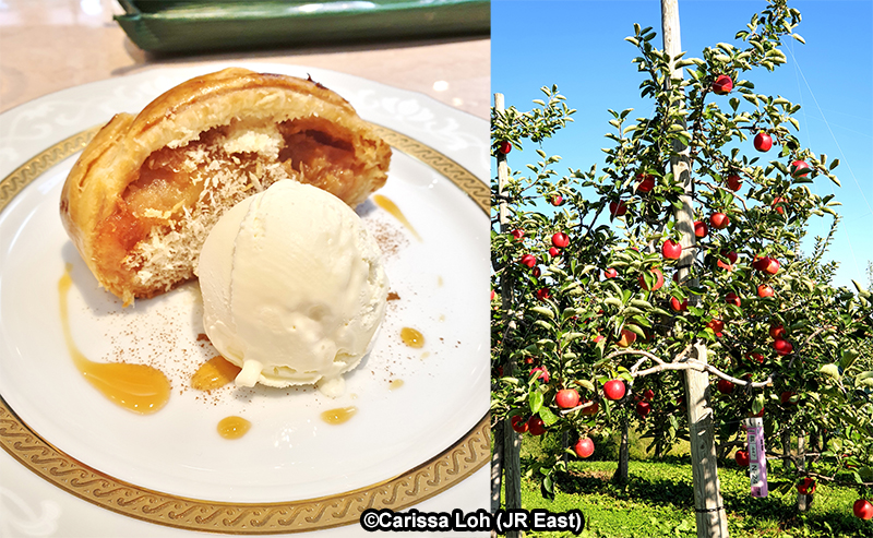 Apple pie in Hirosaki (left) and apple fields in autumn (right). (Image credit: JR East / Carissa Loh)