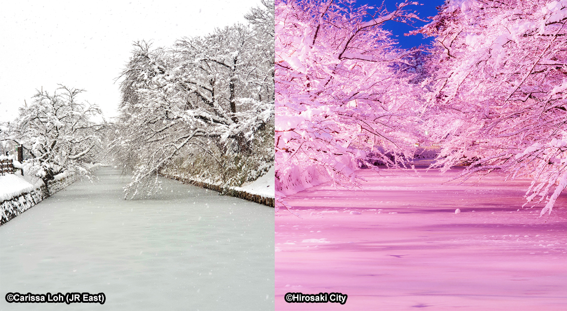 Hirosaki Park's snow-covered sakura trees during the daytime (left) and illuminated with pink light at night (right). (Image credit: JR East / Carissa Loh (left) and Hirosaki City (right)