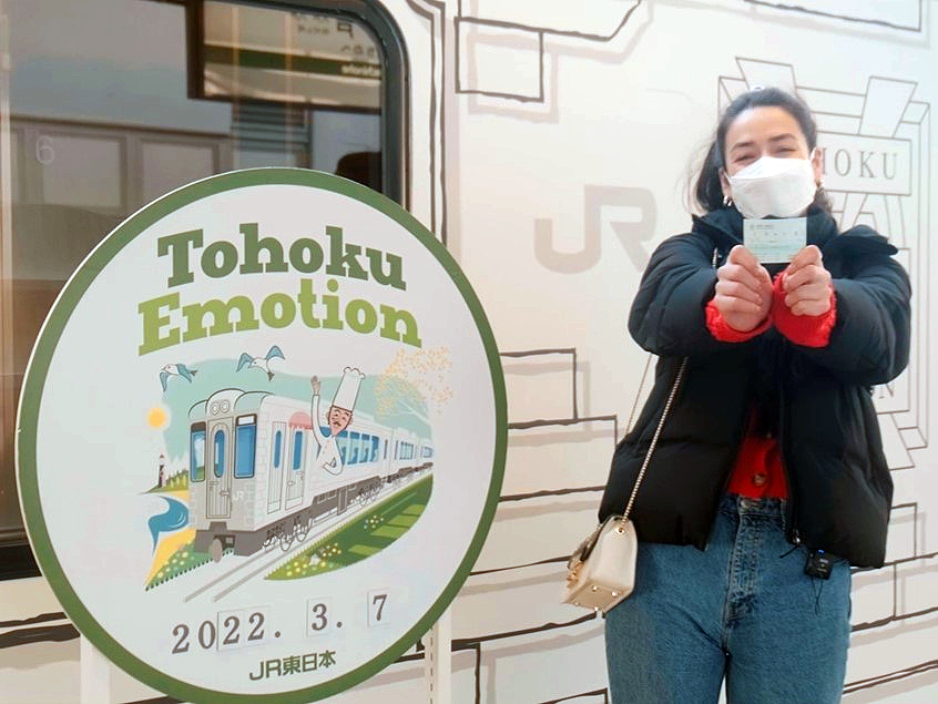Anna was on her way to JR Hachinohe Station to hop on the TOHOKU EMOTION, one of JR East’s Joyful Trains that offer unique themes and experiences of railway travel around eastern Japan. The TOHOKU EMOTION is the flagship of dining Joyful Trains, and passengers riding the train will enjoy a special dining experience with a five-star service by the staff while riding it.