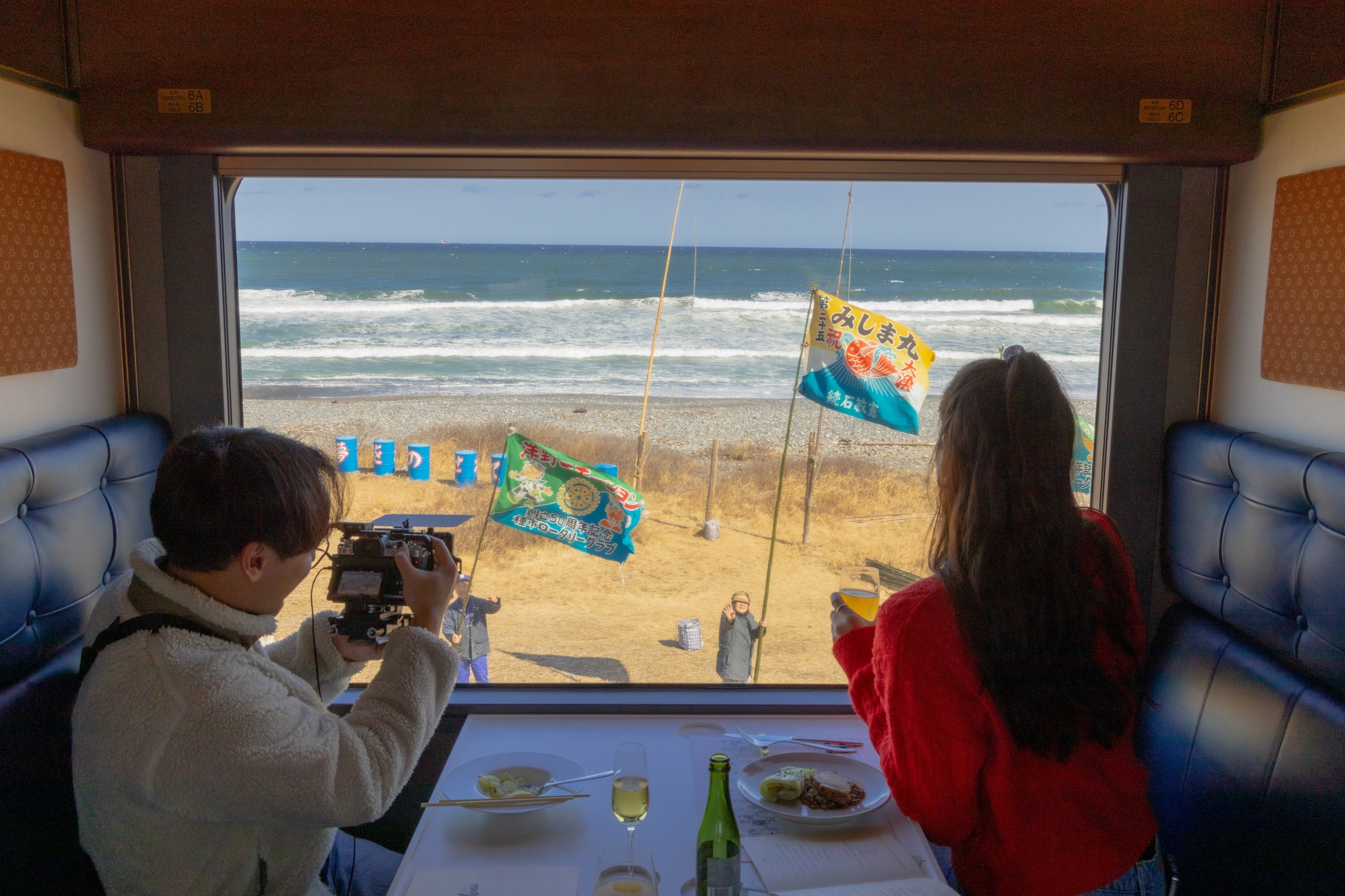 The train made its debut in 2013, and it was to promote the Hachinohe Line (八戸線 Hachinohe-sen) which was severely damaged by the Great Eastern Japan Earthquake and Tsunami in 2011. It is made up of three cars altogether: Car 1 is the private compartment car, Car 2 is the live kitchen car where passengers can view their meals being prepared in person, and Car 3 is the open-dining car resembling a restaurant.