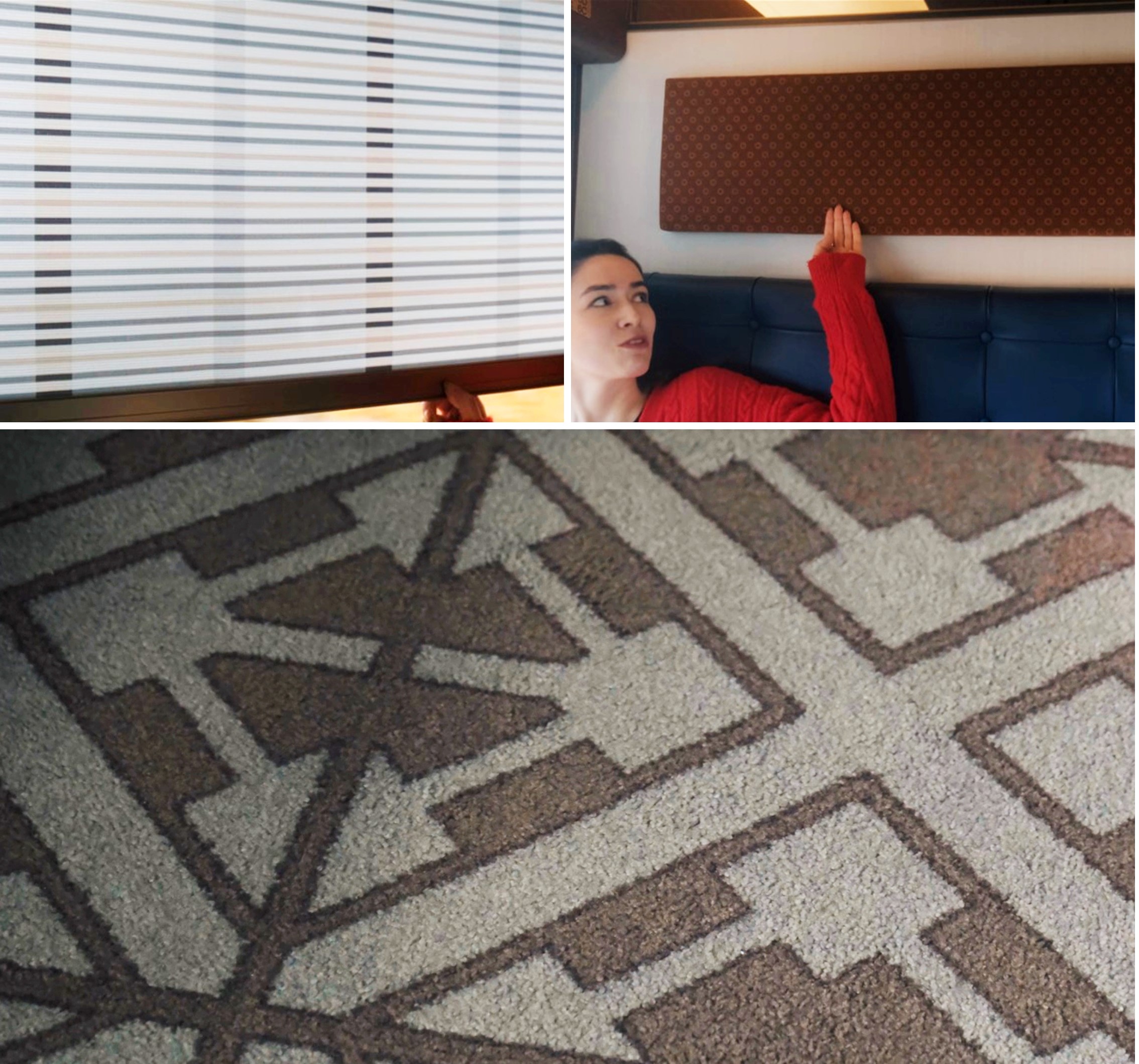 Interiors made from sashiko ori inside the train (top) and kogin sashi embroidery on the floor (right). (Image credit: Japan Travel)