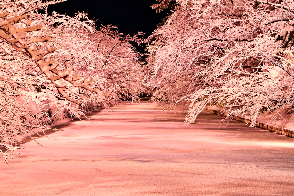 Bonus: If you can’t make it during the festival dates, don’t worry, you’ll still be able to enjoy the snow and another special sight: “snow sakura”. Every spring, view of Hirosaki Castle Park’s 2,600 cherry blossom trees in bloom is one of best in Japan. In winter, snow accumulates on the bare branches of the trees and on the moat below, and on every night from December to February, these trees are illuminated with pink light, making them look like sakura is blooming!