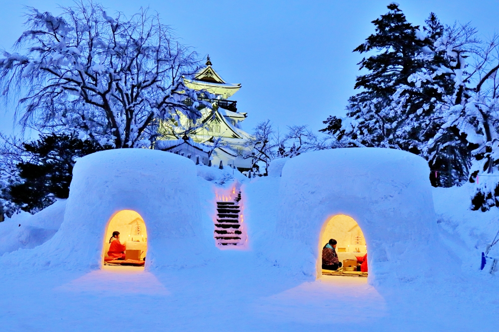 Featuring an array of fun activities, the festival shines a spotlight on kamakura (かまくら), which are snow huts/igloos. Inside each kamakura is an altar made of snow, where people can pray to the water deity. Around 100 kamakura are erected around the city, and there are many events to be enjoyed during the festival.