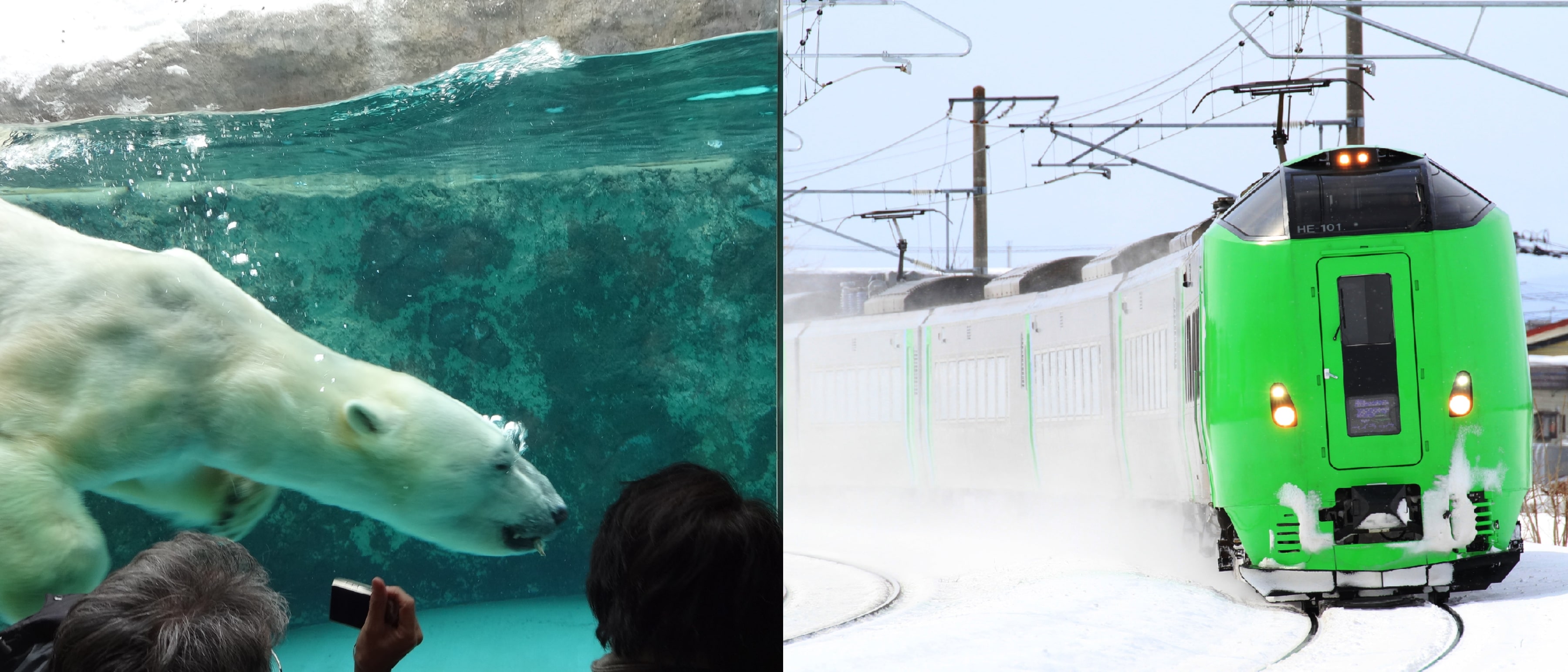 Polar bears in Asahiyama Zoo (left) and the Limited Express Lilac / Kamui (right). (Image credit: Hokkaido Railway Company)
