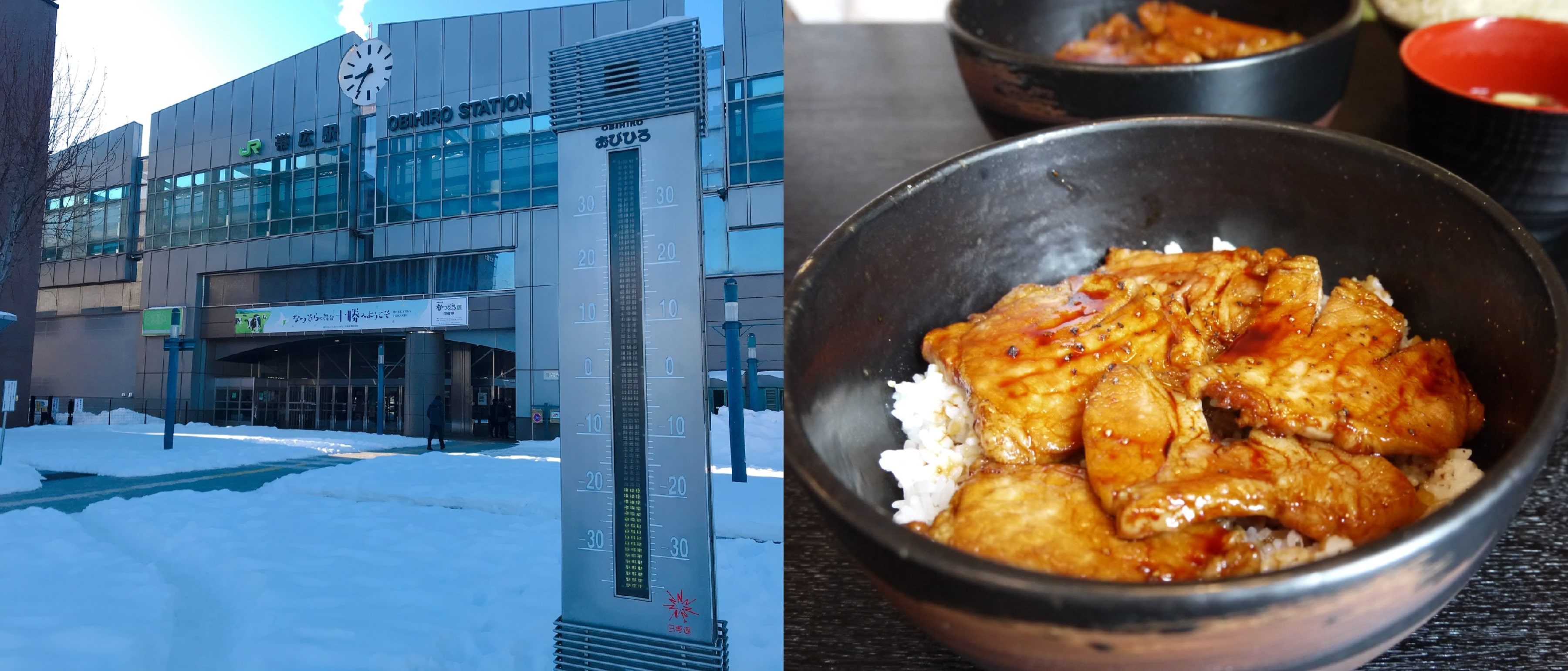 JR Obihiro Station (left) and buta-don (pork rice bowl), a specialty of Obihiro. (Image credit: Hokkaido Railway Company)