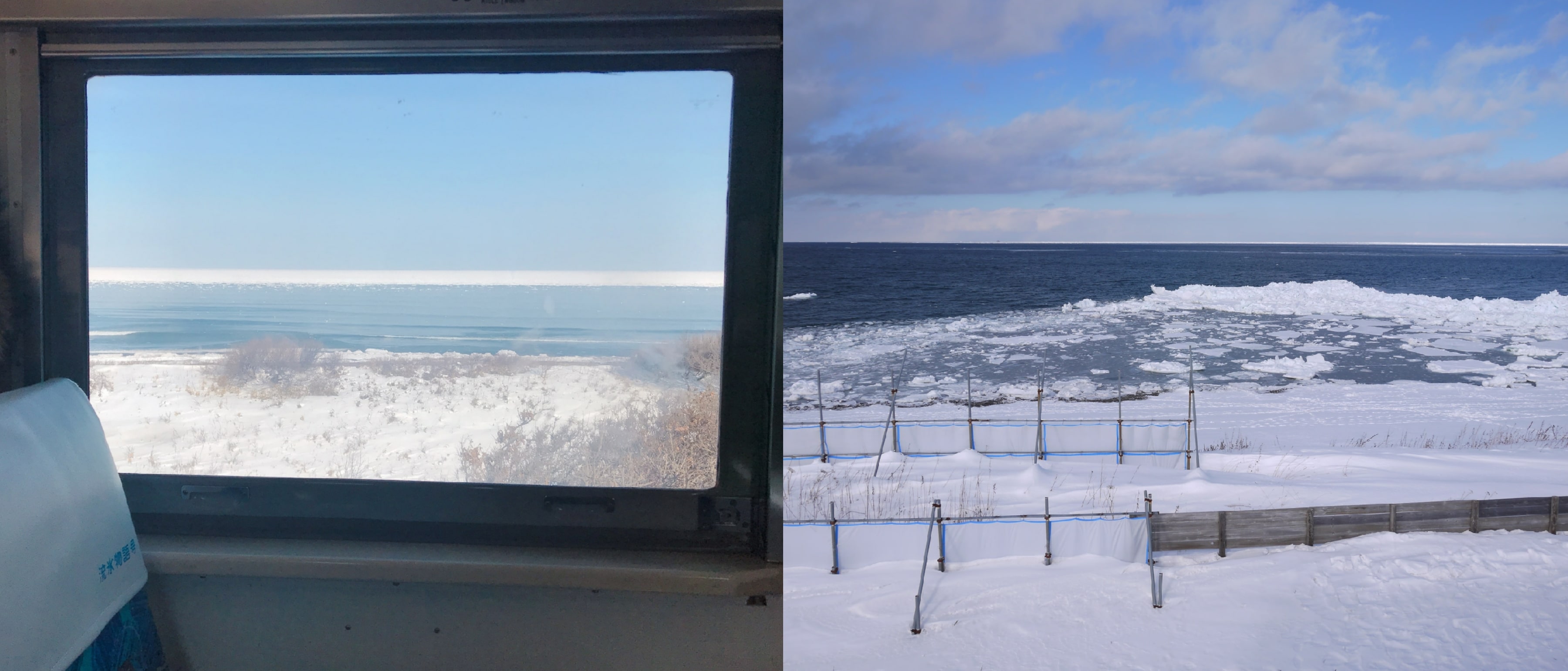 The Sea of Okhotsk (left) seen from the train window, and drift ice (right) near the shore. (Image credit: Hokkaido Railway Company)