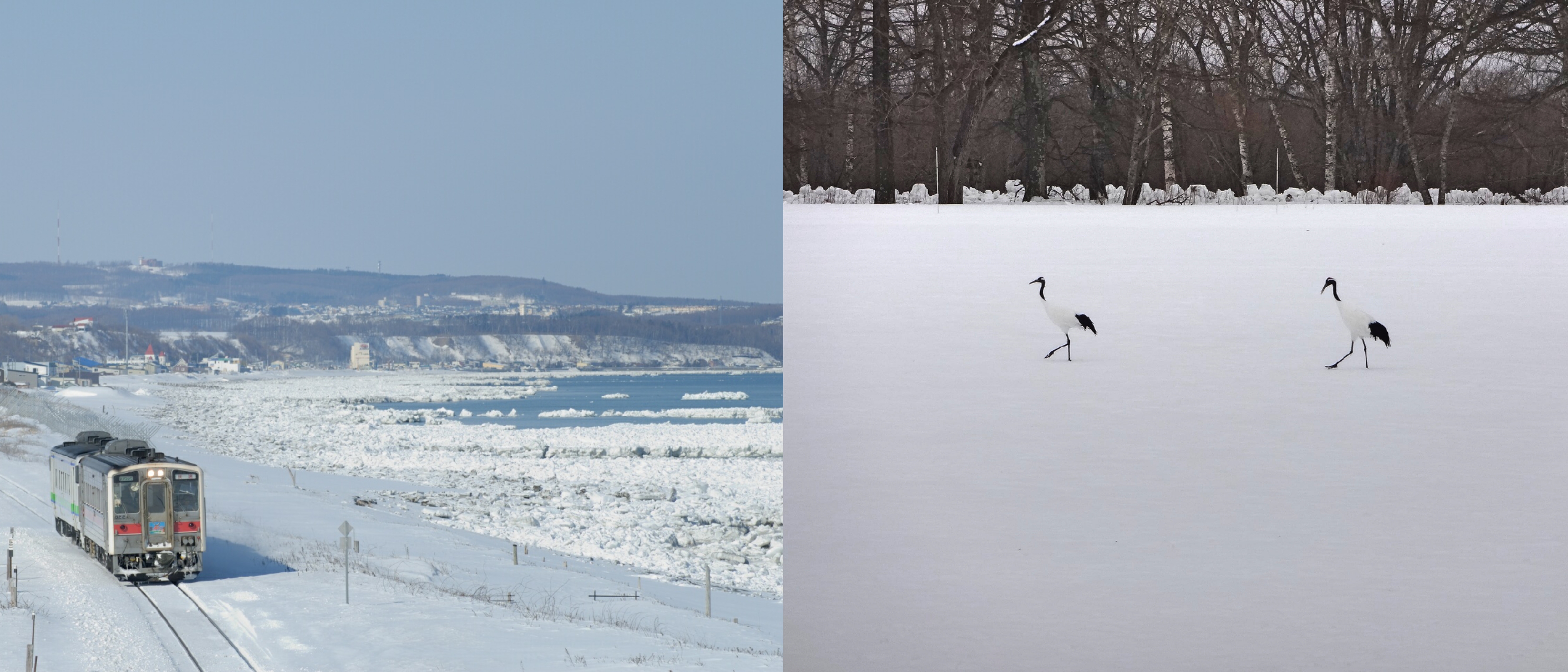 The train runs along the Sea of Okhotsk (オホーツク海 Ohōtsuku-kai), where you can see drift ice. The formation of the drift ice always changes depending on the wind and sea waves, and often times the drift ice come remarkably close to the coast. The Sea of Okhotsk is the only place that you can see the drift ice in Japan.
