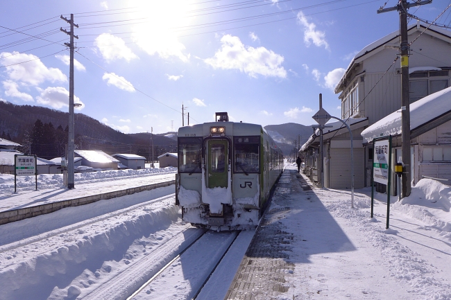 While the other two lines featured in this article are all in the Tōhoku region, the last to be showcased starts in the Tohoku region but ends in Niigata Prefecture. The Yonesaka Line (米坂線 Yonesaka-sen)—connecting Yonezawa Station (米沢駅 Yonezawa-eki) in Yonezawa City, Yamagata Prefecture with Sakamachi Station (坂町駅 Sakamachi-eki) in Murakami City, Niigata Prefecture—is yet another local line featuring spectacular views in winter.