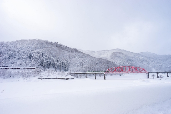 A Kitakami Line train running on the red bridge across the snow-blanketed Kinshūko. (Image credit: 西和賀町 / 橋本翔也様)