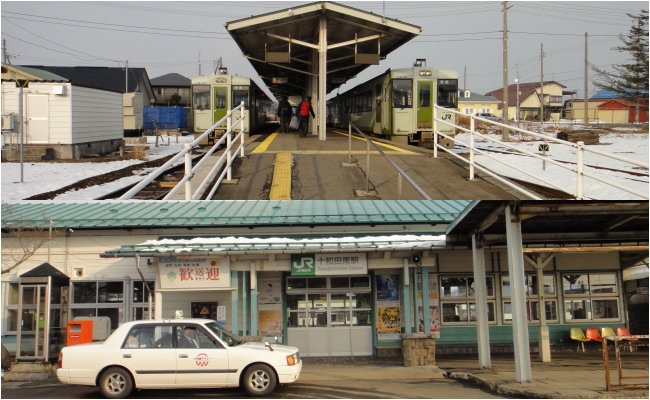 A train departing Minami-Yonezawa Station on the Yonesaka Line en route to Yonezawa, and the exterior of the station. (Image credit: Kevin Koh)