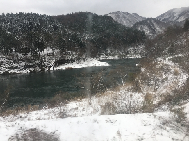 The scenes that left the deepest impression on my mind, though, were those I saw on the Niigata section of the line. As it runs alongside Arakawa River (荒川Arakawa), a major river flowing through Yamagata and Niigata before emptying into the Sea of Japan, picturesque views with the river on the left and the snow-capped peaks of the Asahi Mountain Range in the background can be had. In fact, most of the pictures I took while on the Yonesaka Line were from the Niigata section, testament to how breathtaking the scenery was (and made better with sips from a can of a local sake from Niigata!).