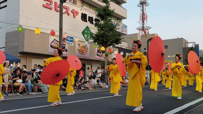 If you are not satisfied with just looking at the dances, join in the fun and experience the Hanagasa dance yourself! At the beginning of the festival, there is a wa-odori (輪踊り circle dance) segment where the crowd can join in the dance. Anyone and everyone are welcome; don’t worry if you do not know how to dance, for there are instructors who will teach you how to dance. You will receive a hanagasa-shaped fan to use as the hat, and you can dance with this. Another chance to join in the parade is at the end, marked by a sign saying “飛び入りコーナー” (tobiiri kо̄nā, which means “Jump-in corner”)