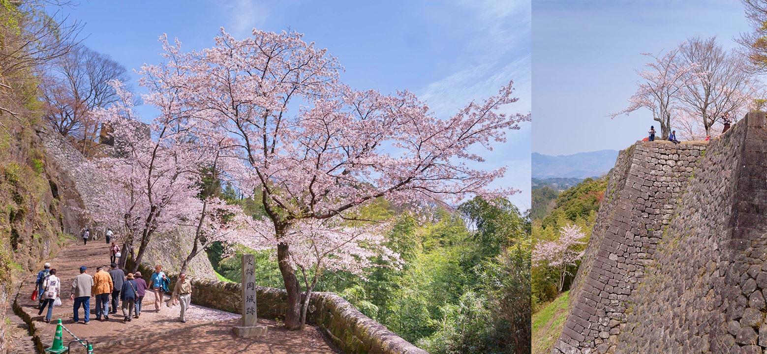 Located on the outskirts of Taketa City (竹田市 Taketa-shi), the Oka Castle Ruins (岡城跡 Okajōato) are situated on top of a 325m-high plateau, giving visitors a breathtaking view of the surrounding mountainous landscape. Adding to the sublime scenery are 1,500 sakura trees, mostly of the Yoshino variety, which add beautiful shades of pink and white to the castle grounds, creating a nice contrast with the surrounding greenery.