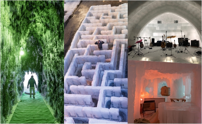 Some of the other activities that can be experienced at other winter festivals—from left to right, an illuminated tunnel, an ice maze, live music performances in an igloo (top) and a bar carved out of ice where you can have a drink (bottom). (Image credit: Low Ka Wei, Bryan Tay)