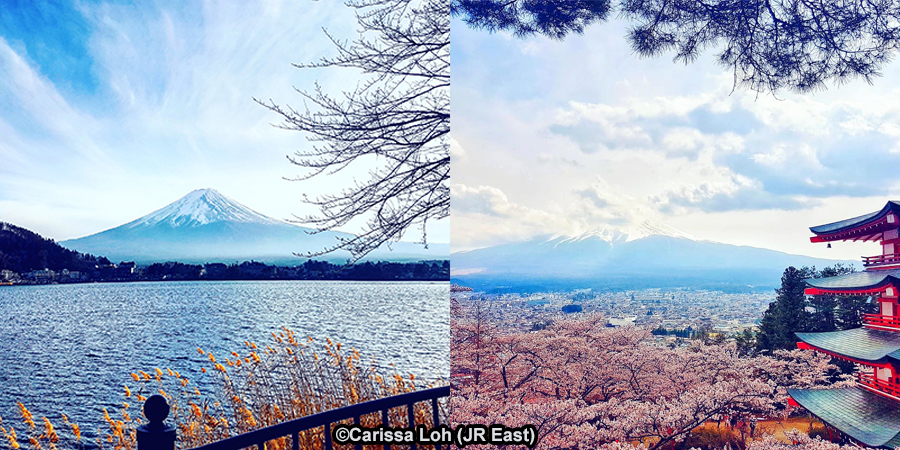 Views of Mount Fuji from Lake Kawaguchi (left) and from Arakurayama Sengen Park (right). (Image credit: JR East / Carissa Loh)
