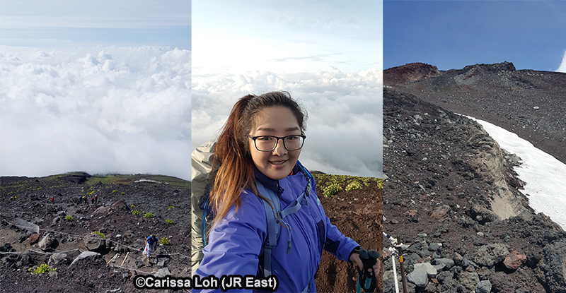 Looking at the trail below (left). Walking above the clouds (center). Mannenyuki (万年雪, ten thousand year snow) – a patch of snow that never melts (right). (Image credit: JR East / Carissa Loh)